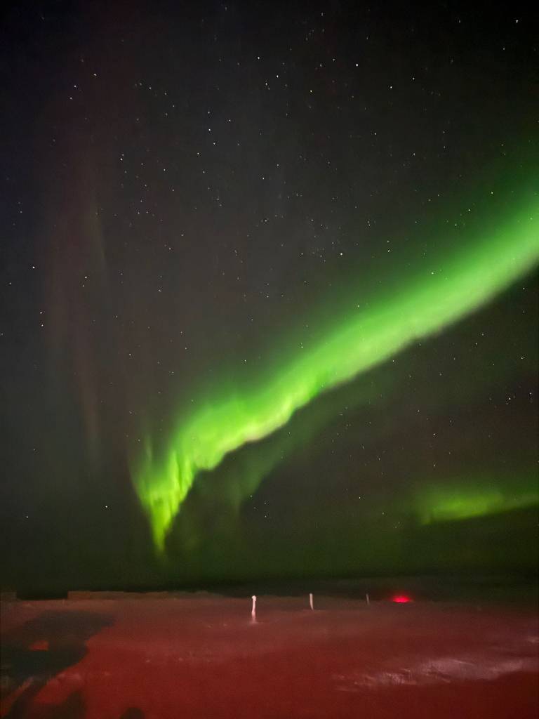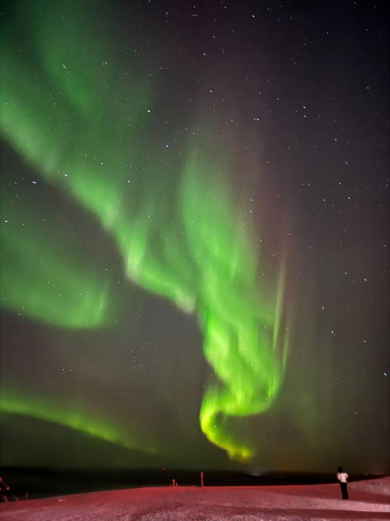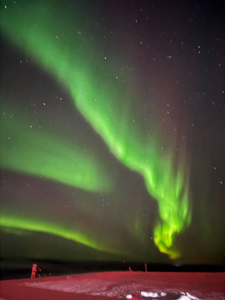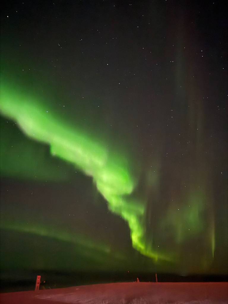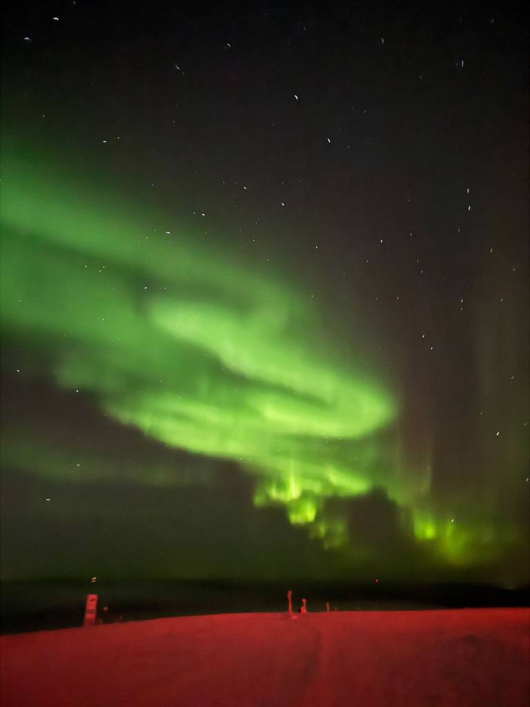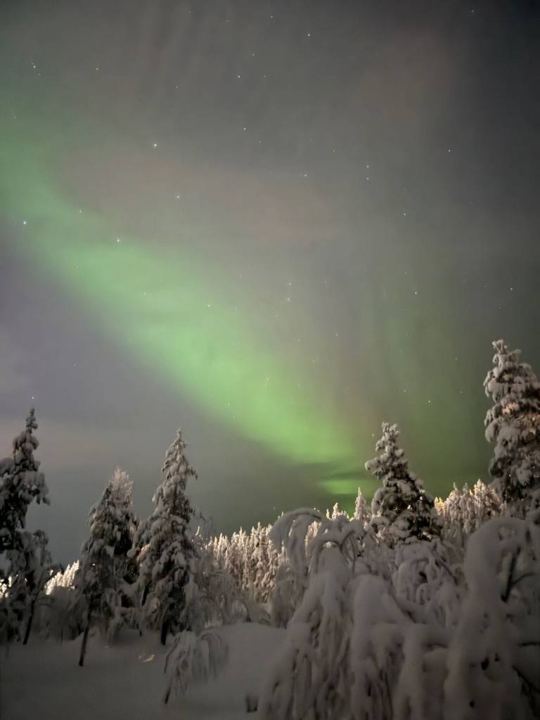 Questa sera non abbiamo niente da fare, ma ad un certo punto l’app di previsioni dell’aurora fa vibrare i telefoni e ci segnala che sta per arrivare con una intensità particolarmente elevata proprio a Saariselka e che non ci saranno nuvole in cielo! Memori della collina scoperta il giorno precedente ci dirigiamo subito lì (vi lascio la posizione e vi auguro vi possa essere utile! https://maps.app.goo.gl/TBH8DbVnBAr5kt29A) e la magia ha inizio: l’aurora boreale si mostra in tutto il suo splendore, ancora e ancora, continuando a mutare di forma, ma sempre con una intensità incredibile.