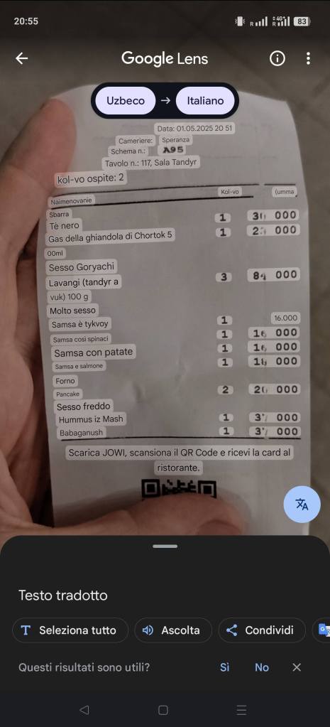 Liquirizia consiglia: “A parte il buffo scontrino, Google Translate è d’obbligo in Uzbekistan, non molte persone parlano Inglese (o altre lingue note), ma tutti saranno disposti a comunicare con voi leggendo le traduzioni sul telefono o facendo leggere direttamente alle App ciò che loro hanno dettato in Uzbeko”.