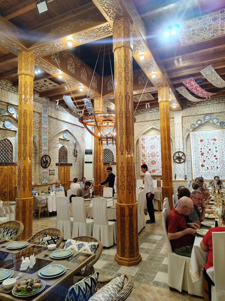Avremmo voluto cenare nel rinomato Old Bukhara, noto per il buon cibo e la musica dal vivo, ma purtroppo non aveva posto e ci siamo rifugiati al “fresco” del ristorante a bordo della grande vasca presente nella piazza principale, chiamato Labi Hovuz, molto turistico, dove Elisa ha dovuto affrontare la realtà che l’Uzbekistan non è un paese per vegetariani e si è “sacrificata” mangiando una pizza (non era così male)!