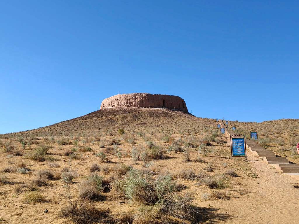 Ripartiamo dopo pranzo e il termometro segna 43°C, il nostro driver è sorpreso quanto noi. Lungo la strada ci fermiamo alcuni minuti presso un antico caravanserraglio costruito presso una oasi: qui avvistiamo alcuni cani della prateria che ci osservano curiosi e spaventati.