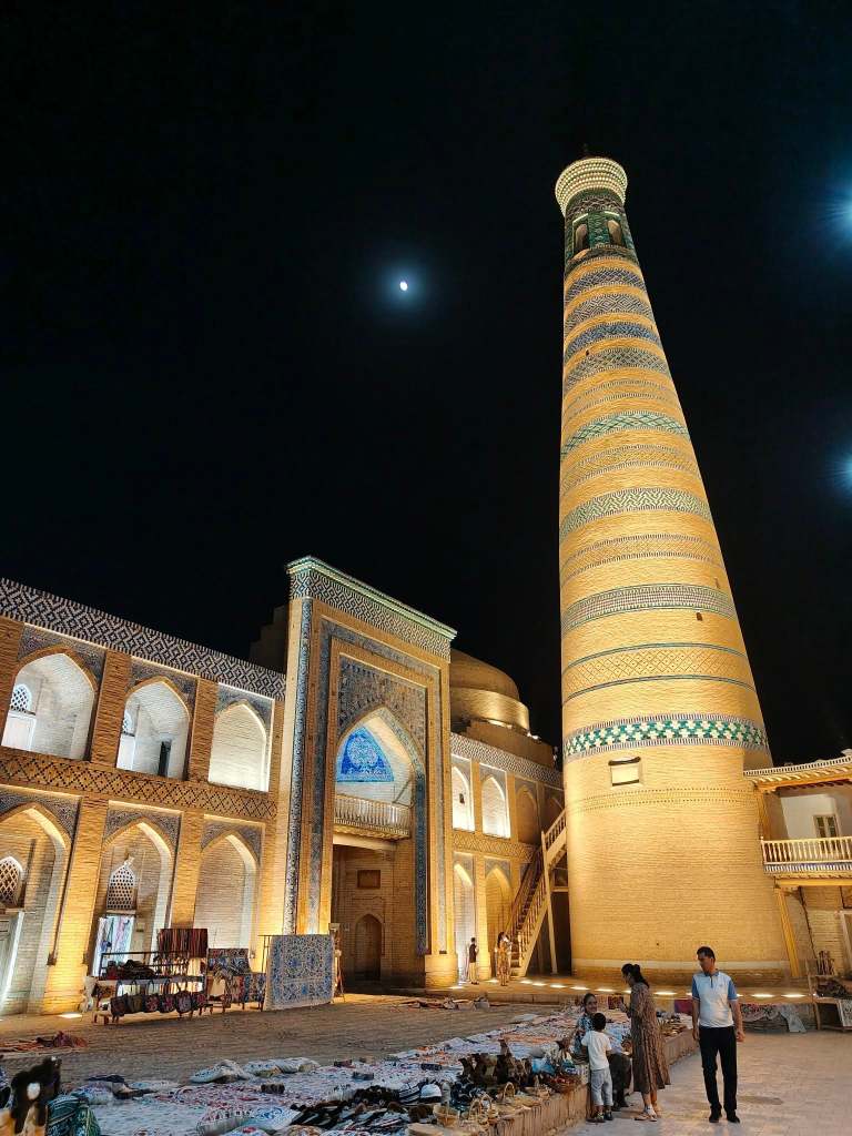Infine, arriviamo a Khiva in serata e la prima impressione è quella di essere finalmente arrivati nell’Uzbekistan che ho sempre sognato! Sembra tutto perfetto, soggiorniamo al Tosh Darvoza, un hotel gestito da un simpaticissimo proprietario con il suo gatto, una camera magnifica (con upgrade gratuito) e abbiamo cenato in un clima finalmente amichevole (finché non è arrivata la pioggia), con vista su un minareto meraviglioso. E in più la città è piena di gatti, finora quasi non pervenuti! Good vibes!