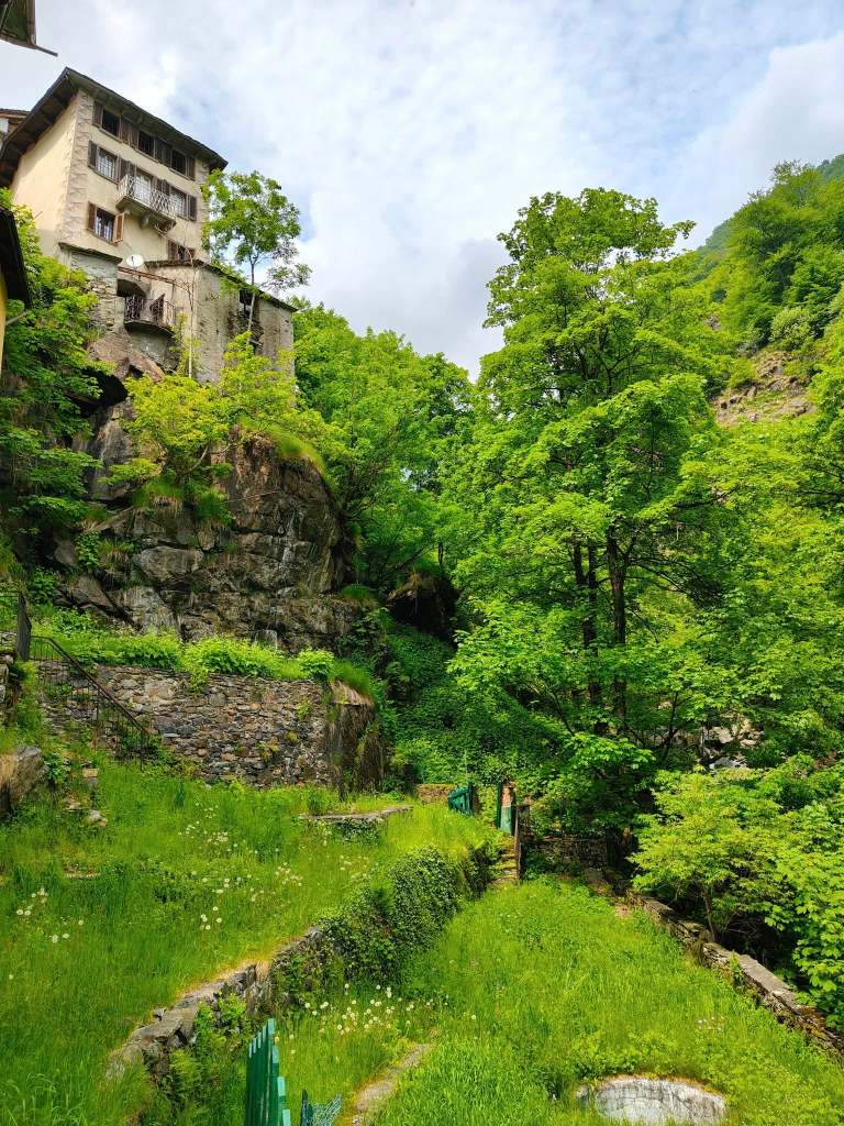 Dopo un’ora di cammino su sentieri meravigliosamente silenziosi e ombreggiati, decidiamo di tornare alla macchina per arrivare all’ultimo centro abitato della valle, il borgo walser di Campello Monti, circondato da una lussureggiante vegetazione che ricorda a suo modo una nostrana foresta pluviale. E infatti… piove! Fine della gita, ma anche le nuvole, grigie e cariche di pioggia, contribuiscono alla drammaticità delle montagne ricoperte dall’infinita distesa di alberi.