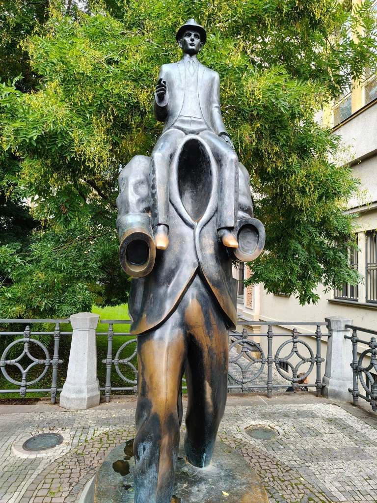Camminiamo lungo la Moldava fino a raggiungere la testa di Franz Kafka, realizzata dall’artista David Černý, appena in tempo per osservarne la rotazione, che crea un gioco di forme e trasformazioni a simboleggiare l’animo tormentato dell’autore.
