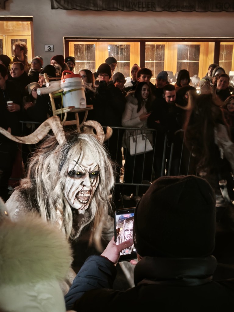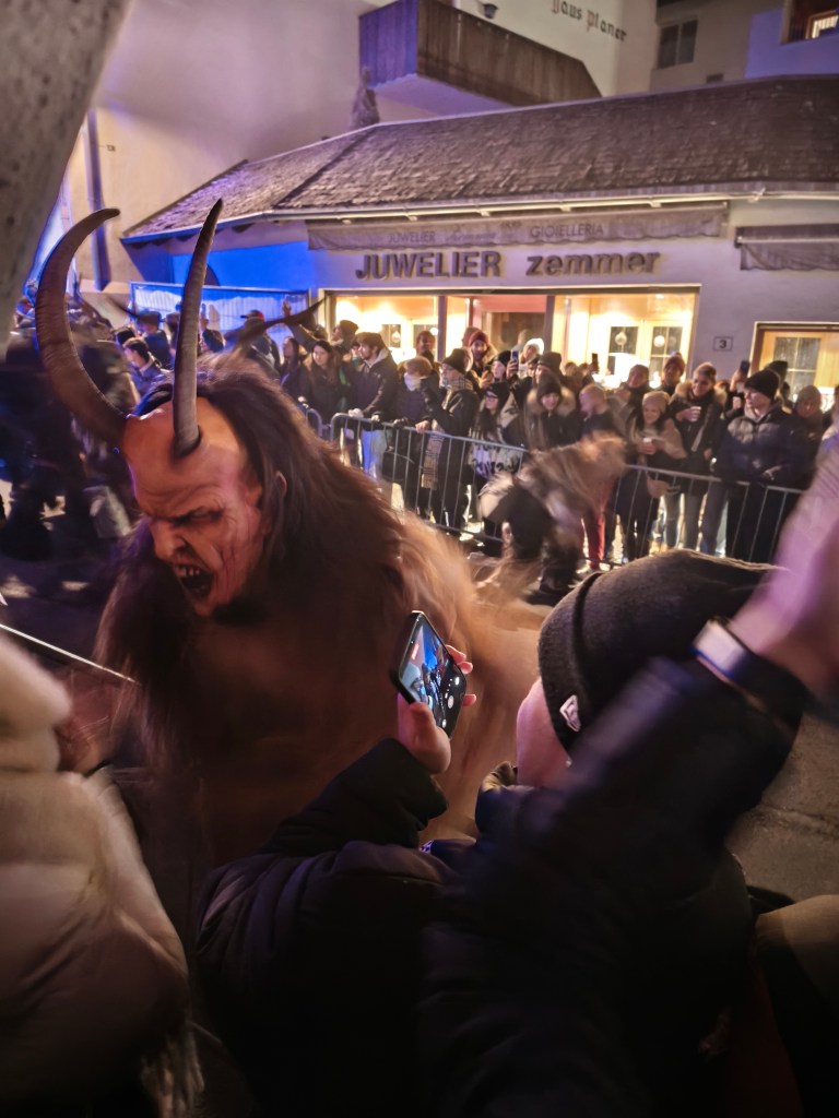 Ebbene sì, solo i coraggiosi dovrebbero stare in prima fila perché questi diavoli sono spaventosi e dispettosi, si arrampicano sulle barriere, le spostano, abbracciano e a volte rapiscono il pubblico, ma sempre nel rispetto della volontà di partecipare al gioco: se vi dimostrerete restii, i Krampus passeranno oltre e al massimo vi spettineranno un po’ o fingeranno di colpirmi con dei bastoncini di saggina!